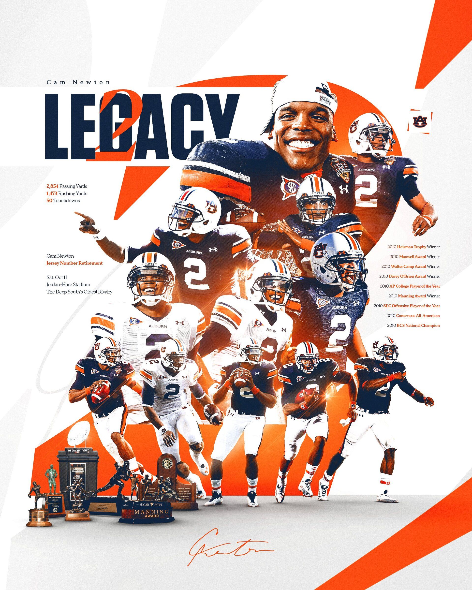 🔼 One Of One. Tomorrow, we honor the legacy of No. 2 in Jordan-Hare Stadium. Cam Newton’s jersey will be retired at halftime of the Deep South’s Oldest Rivalry. Newton joins Pat Sullivan (7), Bo Jackson (34) and Terry Beasley (88) as one of only four Auburn players to have a jersey retired. In 2010, Newton became the first SEC player to pass for 2,000+ yards and rush for 1,000+ yards in a single season, leading the Tigers to a BCS National Championship while earning consensus All-America honors and multiple national awards.
