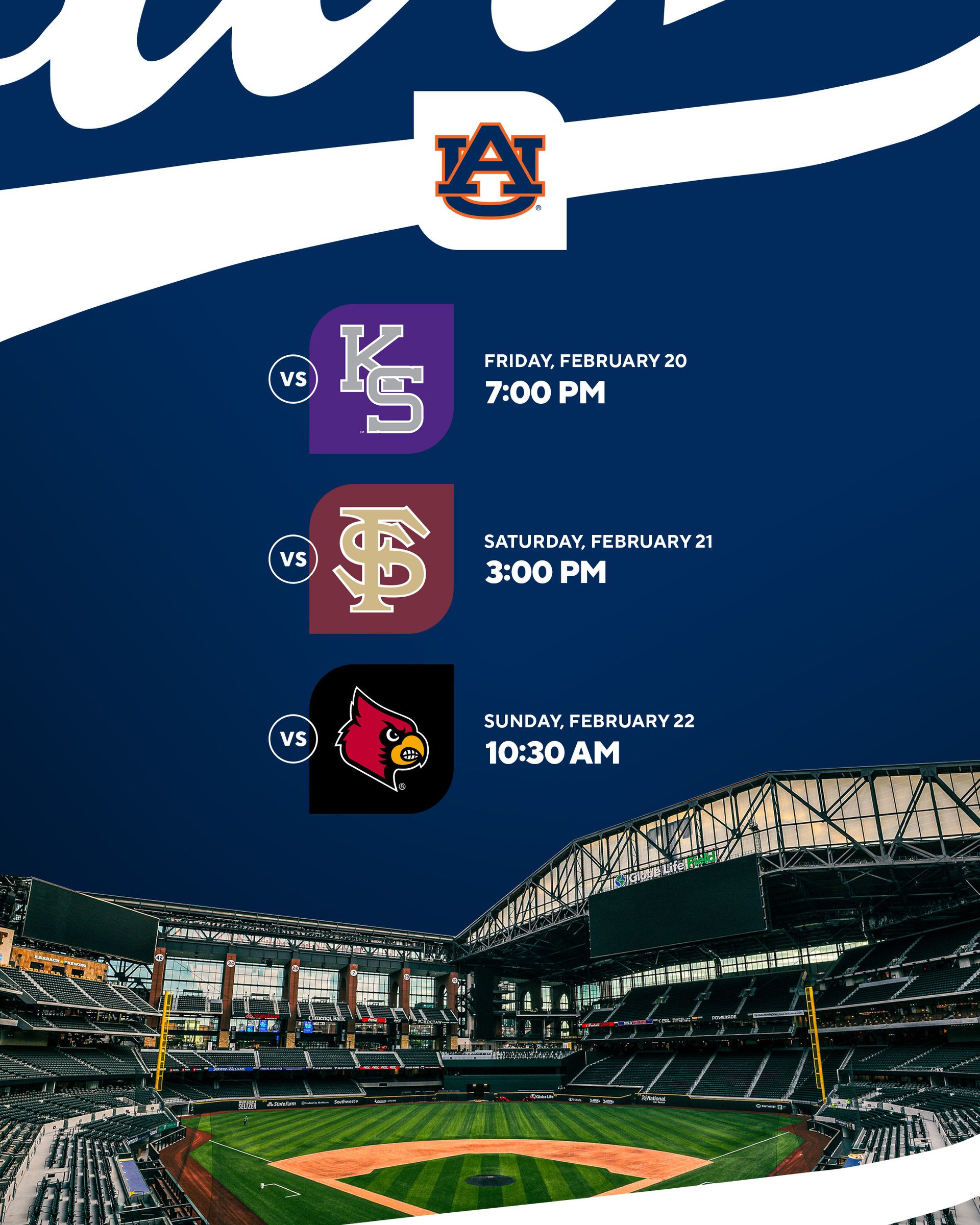 🔼 Takin’ Over Texas. Auburn baseball will play in the College Baseball Series at Globe Life Field in Arlington, Texas! They’ll start the weekend on Friday at 7 p.m. CT when they play Kansas State. On Saturday, they’ll take on Florida State at 3 p.m. CT. The Tigers will conclude the weekend on Sunday when they play Louisville at 10:30 a.m. CT.