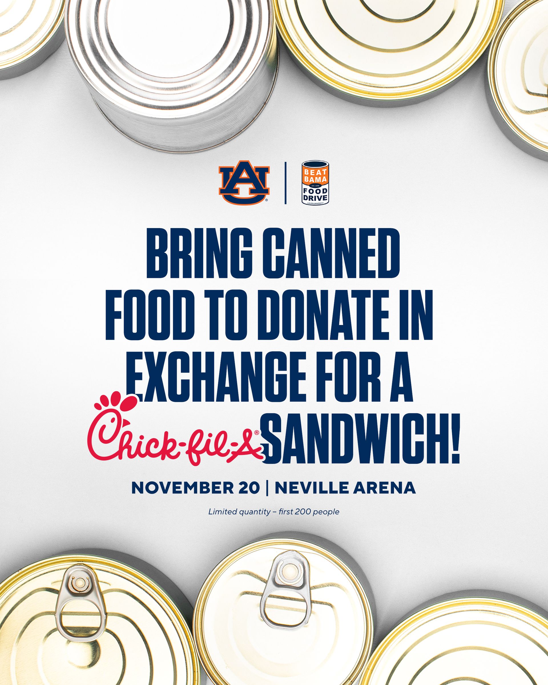 🔼 Help Us Help Auburn. Auburn women’s basketball will host Rutgers tonight at 6 p.m. CT on SEC Network+. The Tigers are taking donations for the Beat Bama Food Drive. Fans who bring canned food will receive a Chick-fil-A sandwich!
