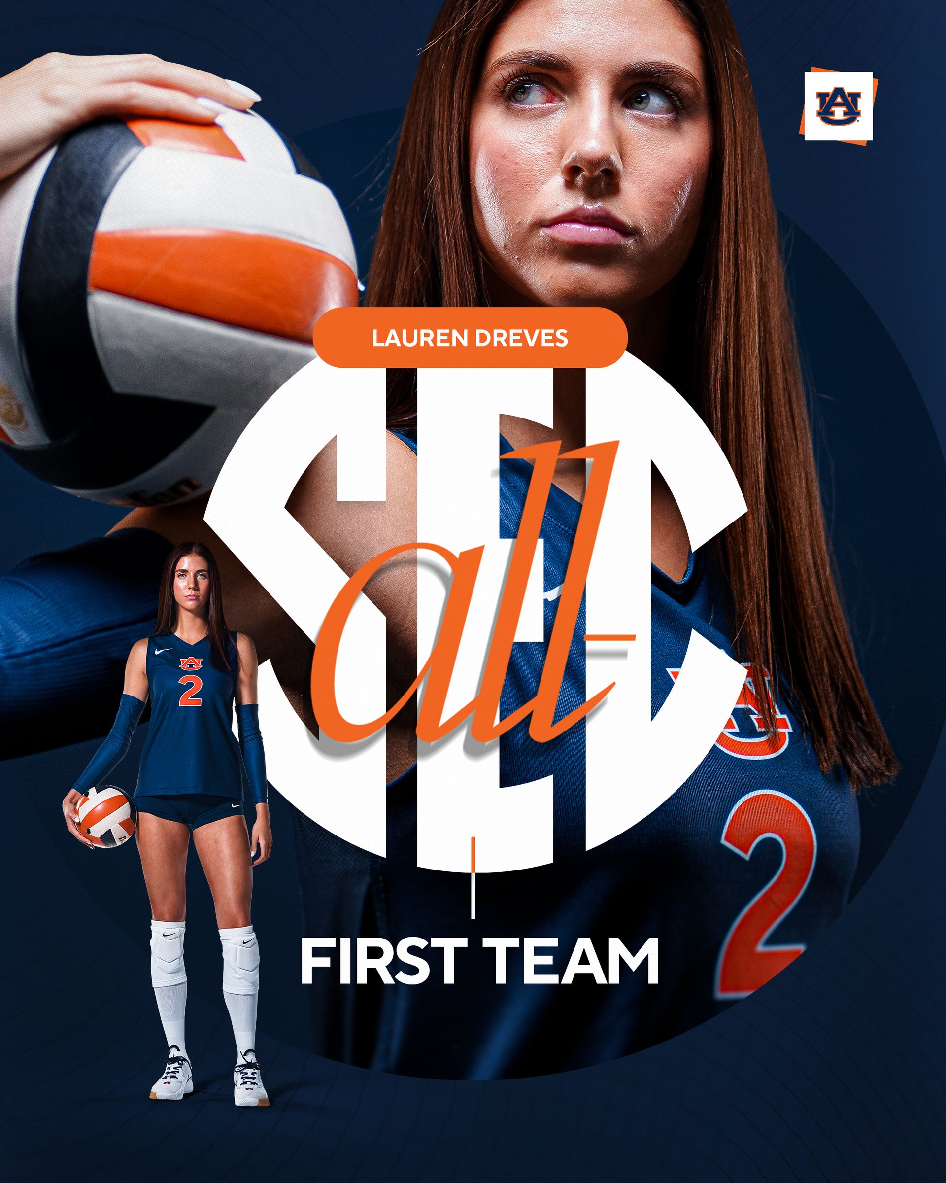 🔼 SEC Star. Auburn volleyball’s Lauren Dreves has been named All-SEC First Team! She has been one of the best left-sides across the SEC. She has posted single-season career highs in kills (360), kills per set (3.83), hitting percentage (.269), blocks (61), blocks per set (0.65), points (403.5) and points per set (4.29). She leads the Tigers with eight double-doubles.