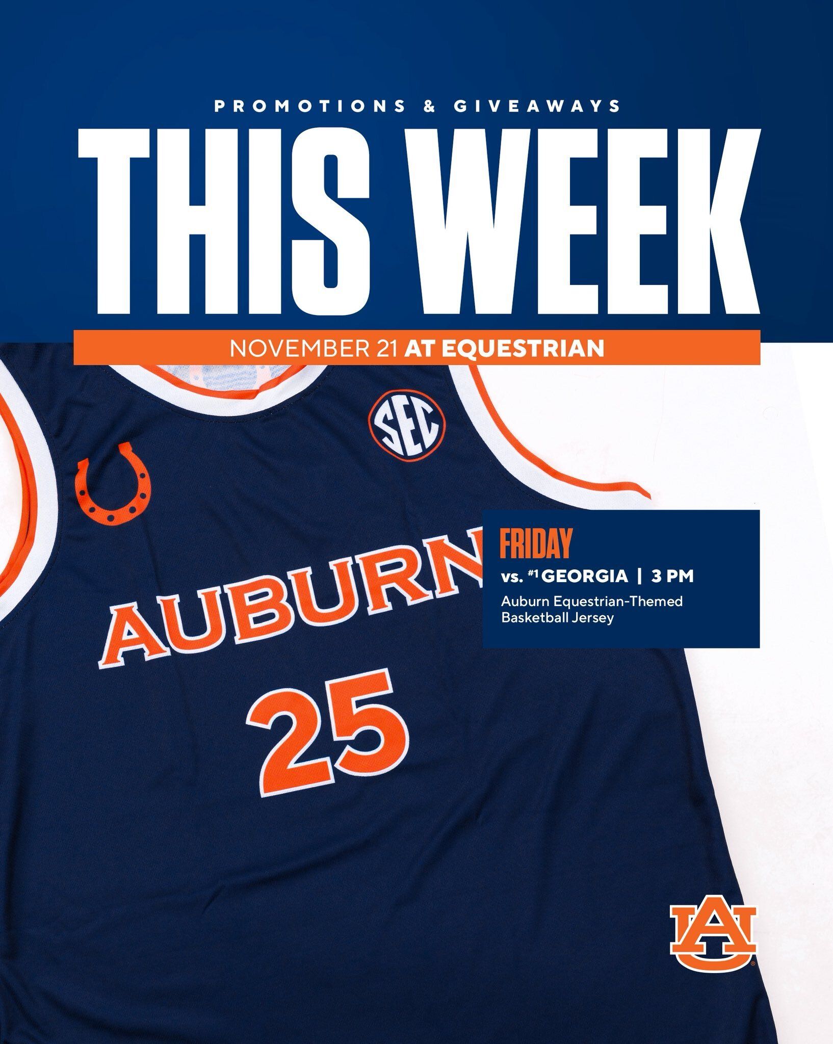 🔼 Battle Of The Best. The top two teams in equestrian are facing off today at the Auburn Equestrian Center! The second-ranked Tigers will host No. 1 Georgia at 3 p.m. CT on SEC Network+. Current Auburn students in attendance will receive a free equestrian-themed basketball jersey!