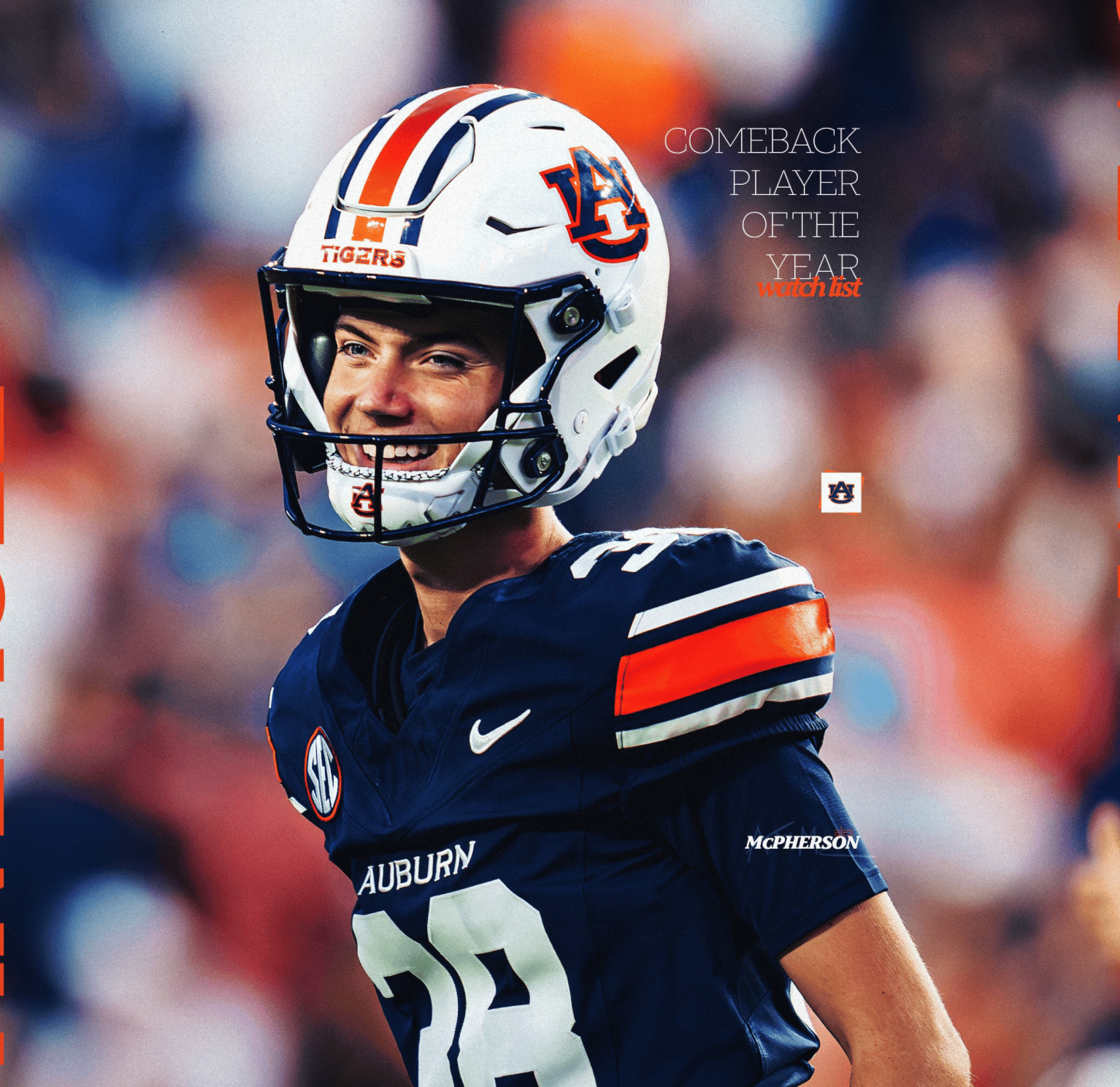 🔼 Pride In Perseverance. Auburn kicker Alex McPherson has been named to the Comeback Player of the Year Watch List! He is a perfect 22-for-22 on extra points this season and has made 13 field goals.