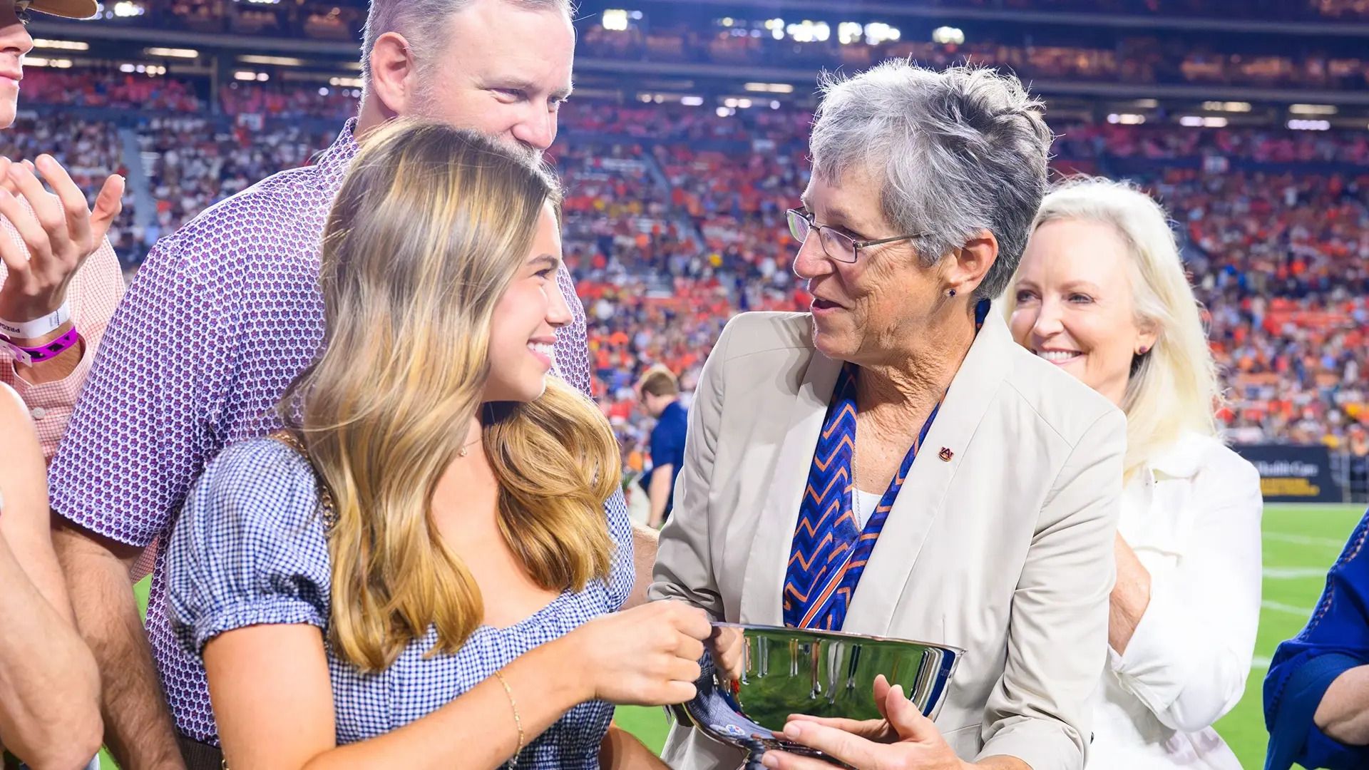 More Decor. Former Auburn women’s golf coach Kim Evans received the Pamela Sheffield Award for her selfless service and commitment to Auburn University. Evans, a 1981 Auburn graduate, led the team to eight SEC championships and was inducted into the National Golf Coaches Hall of Fame. She coached two seasons after being diagnosed with ovarian cancer in 2013 before transitioning to a role as special assistant to the Vice President Office of Student Affairs. She continues to serve Auburn through various volunteer efforts and roles within the university.