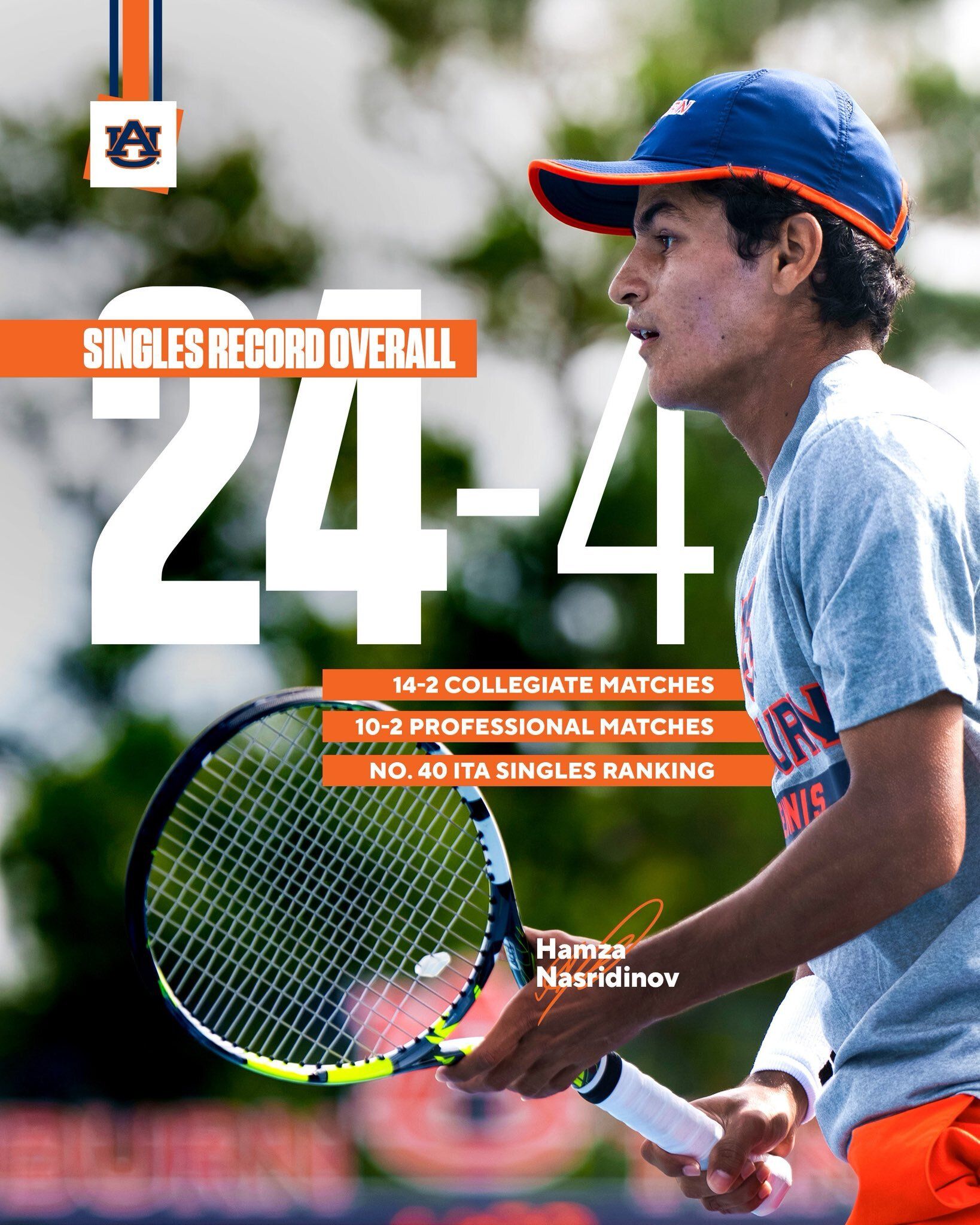 🔼 Heating Up. Auburn men’s tennis sophomore Hamza Nasridinov has been on fire since the summer! He’s gone 24-4 in singles and owns a No. 40 ITA Singles Ranking. Nasridinov went 14-2 in collegiate matches and 10-2 in professional matches over the last few months.