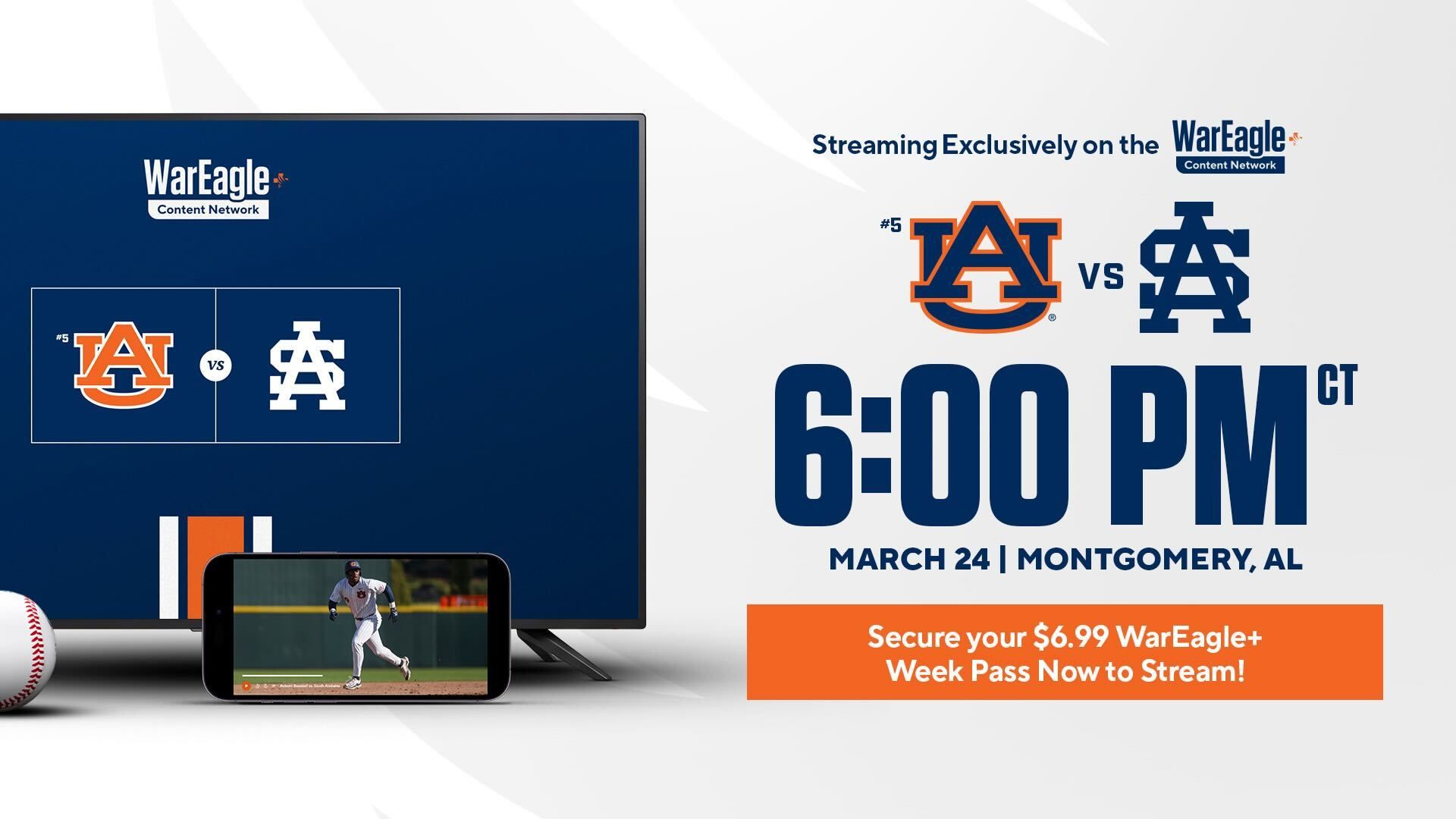 🔼 Home Away From Home. Fourth-ranked Auburn baseball will take its talents to Montgomery tonight! They’ll play South Alabama at Riverwalk Stadium at 6 p.m. CT. Tickets are available here. Fans can watch the game on WarEagle+.