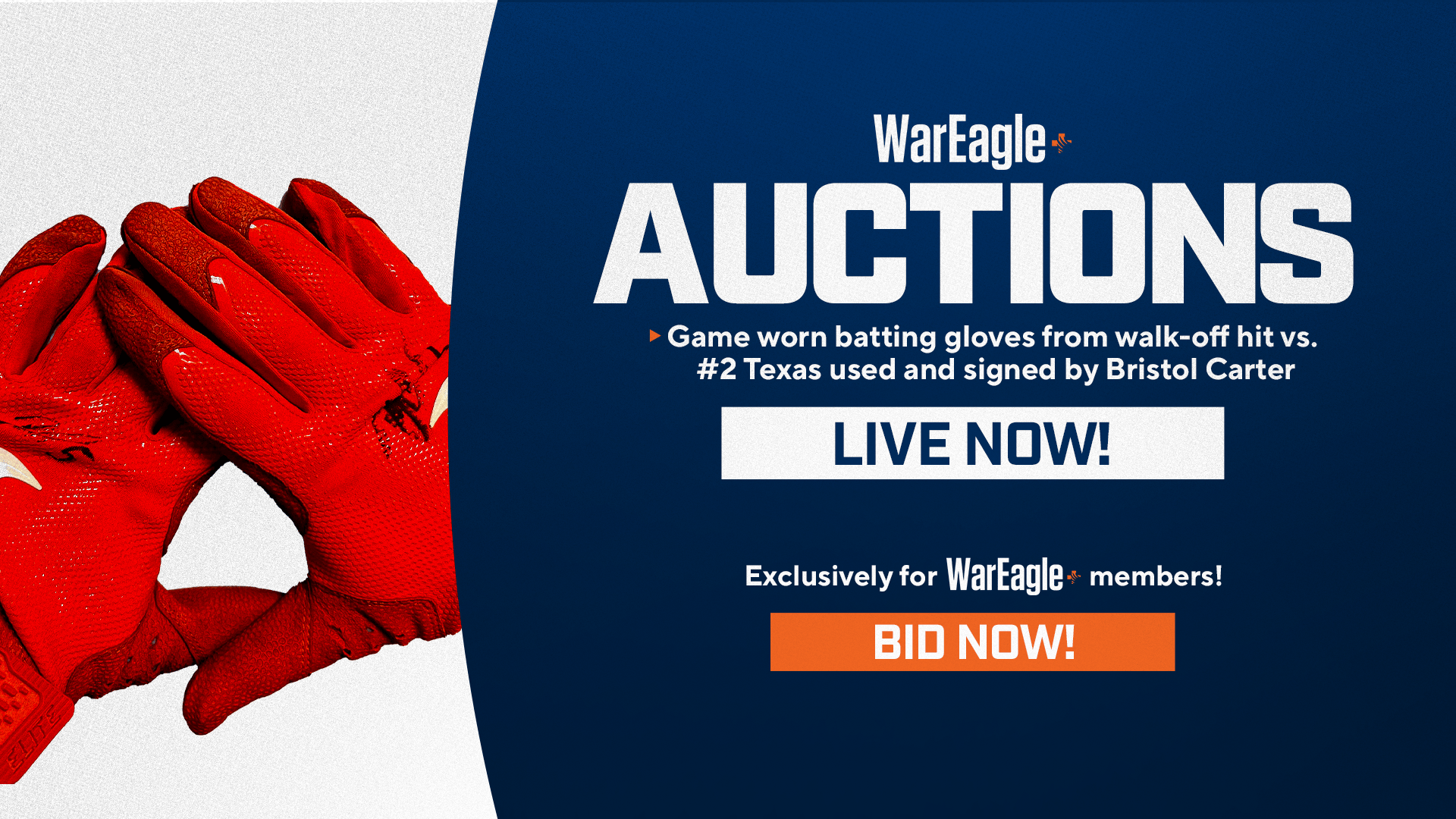 Bristol Carter’s game worn batting gloves from his walk-off hit to beat No. 2 Texas are up for auction! WarEagle+ members can place a bid today.