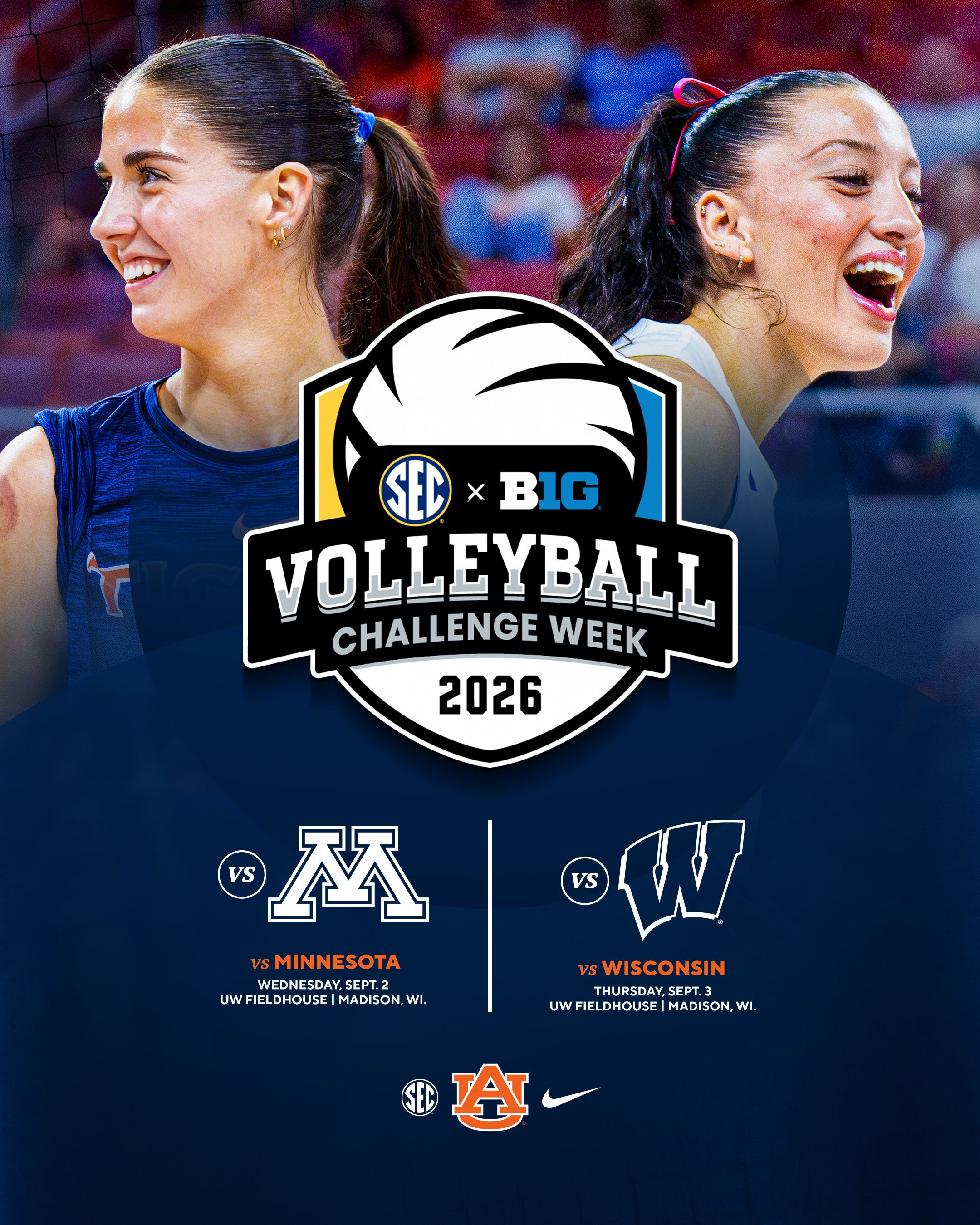 🔼 The Challengers. Auburn volleyball will face Minnesota and Wisconsin in the inaugural Big Ten/SEC Challenge, held in Madison, Wisconsin. They’ll take on Minnesota on Sept. 2 and Wisconsin the following day. All 18 Big Ten schools and all 16 SEC institutions will match up throughout the week.