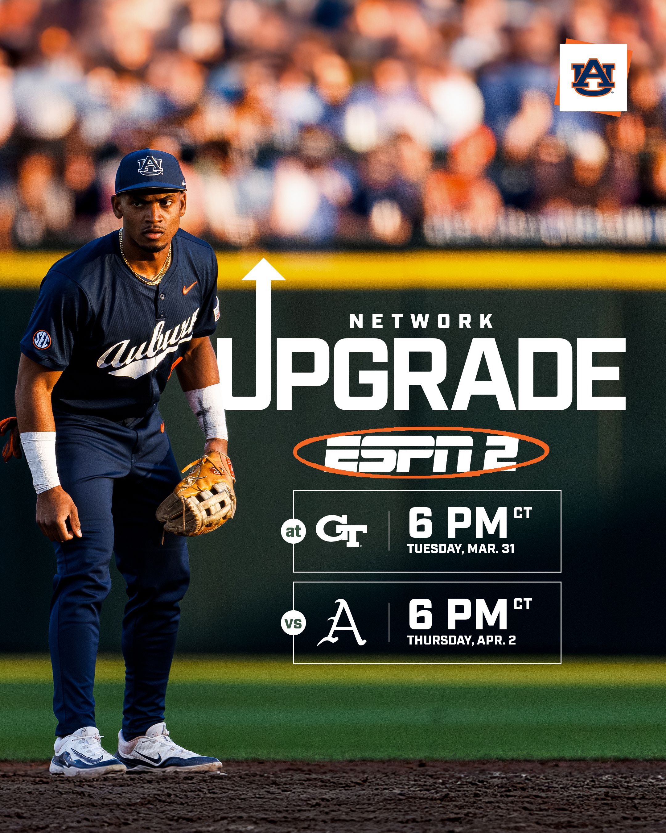 🔼 Rematch Awaits. The 11th-ranked Auburn baseball team will play at No. 3 Georgia Tech tonight at 6 p.m. on ESPN2. The Tigers downed the Yellow Jackets at home earlier this month, 9-2.