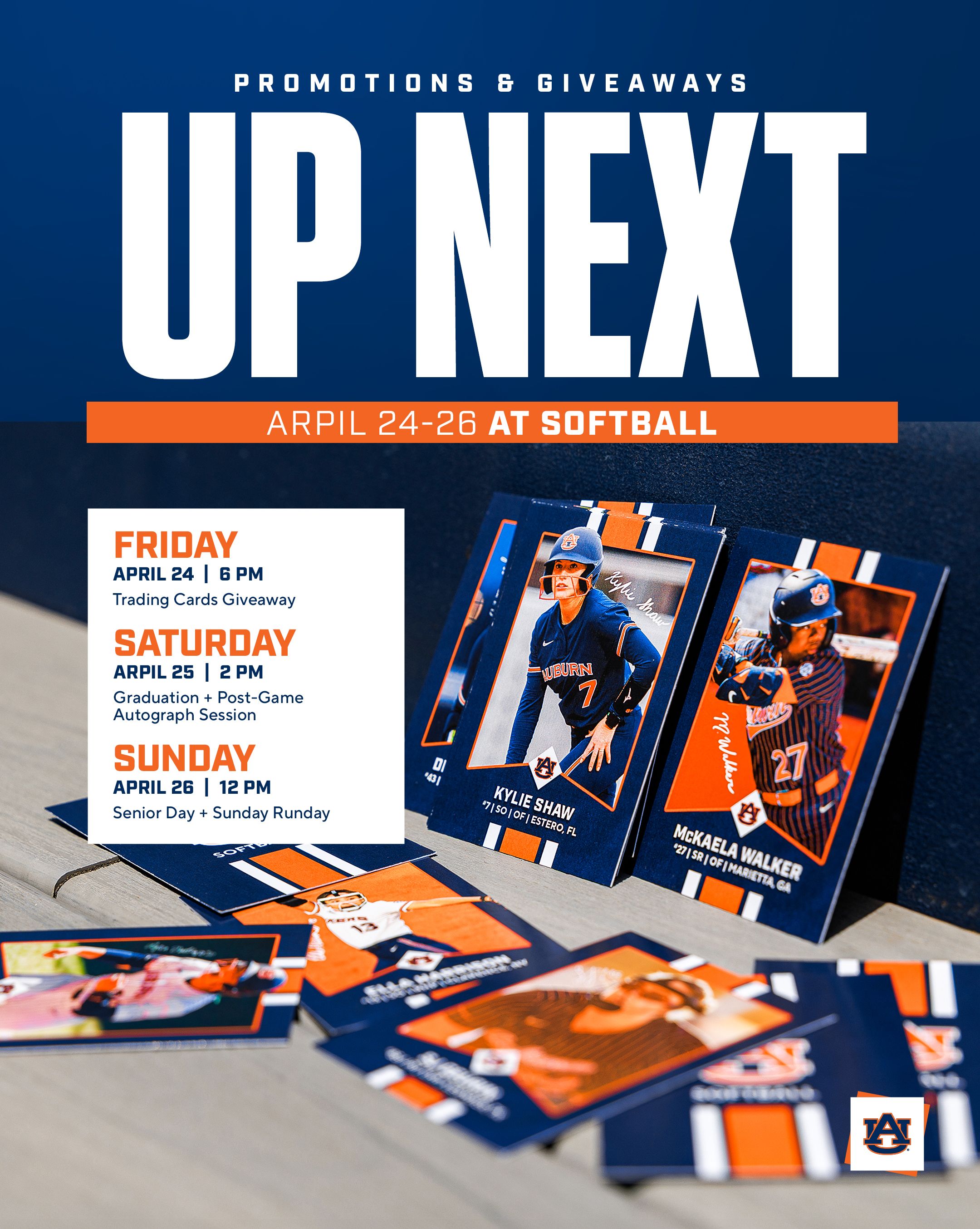 🔼 Celebrating Seniors. Auburn softball hosts Ole Miss for a three-game series at Jane B. Moore Field this weekend. The series begins tonight at 6 p.m. CT and will be broadcast on SEC Network+. Auburn will honor its graduating student-athletes throughout the weekend. Destiny Rodriguez and McKaela Walker will be honored pregame on Sunday.